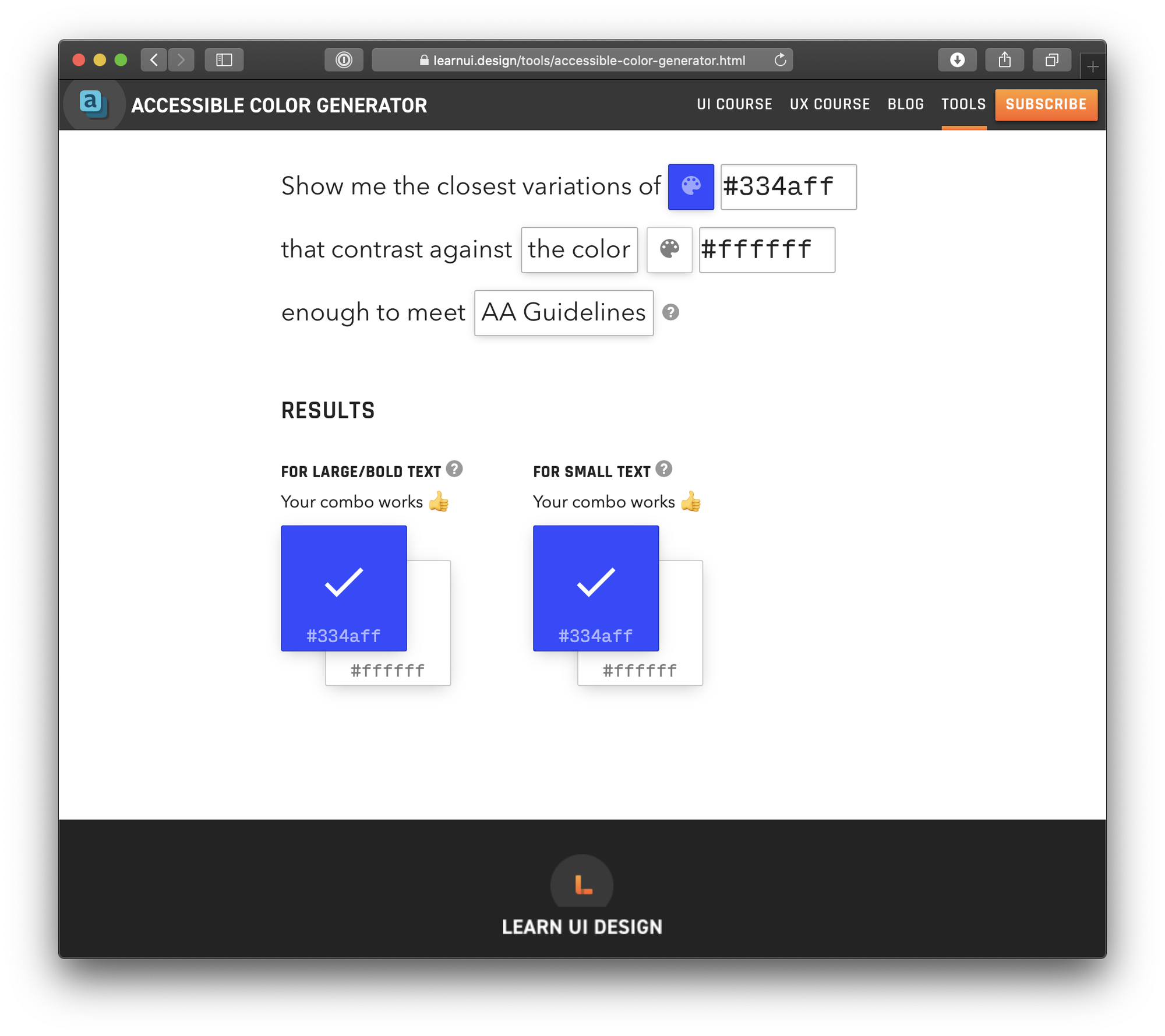 Luckily, there are tools to help scan and audit contrasts. One of those tools, the Accessible Color Generator, helped us find the right shade of blue for The Events Calendar’s default primary color so that we hit at a WCAG AA rating.
