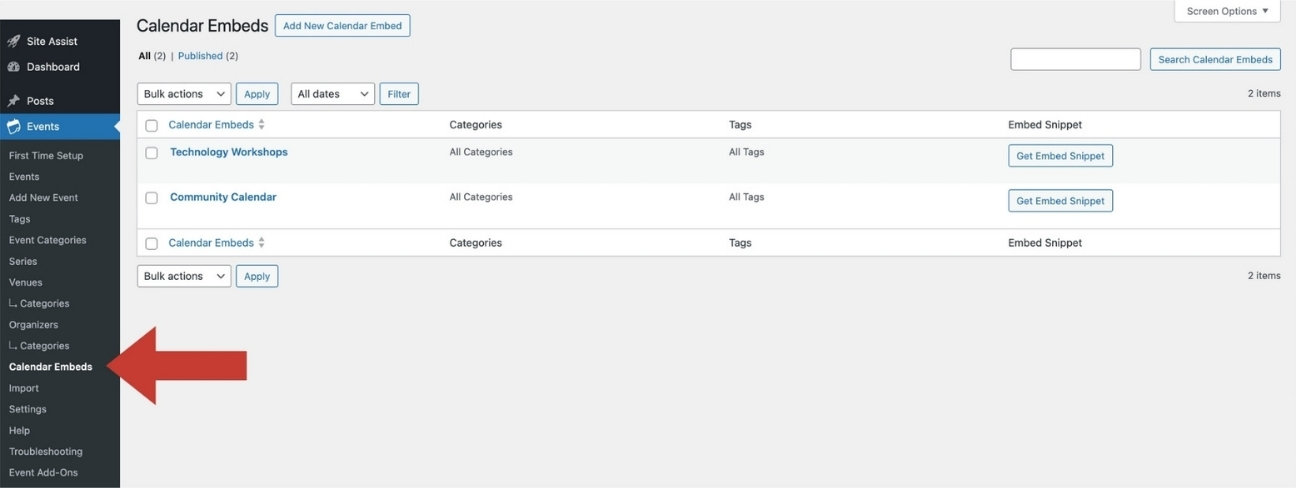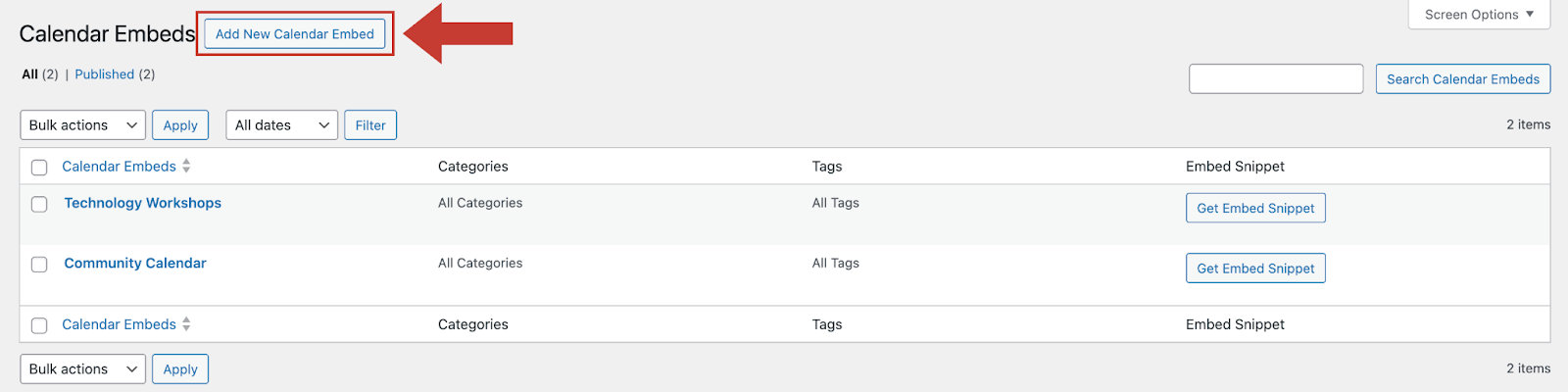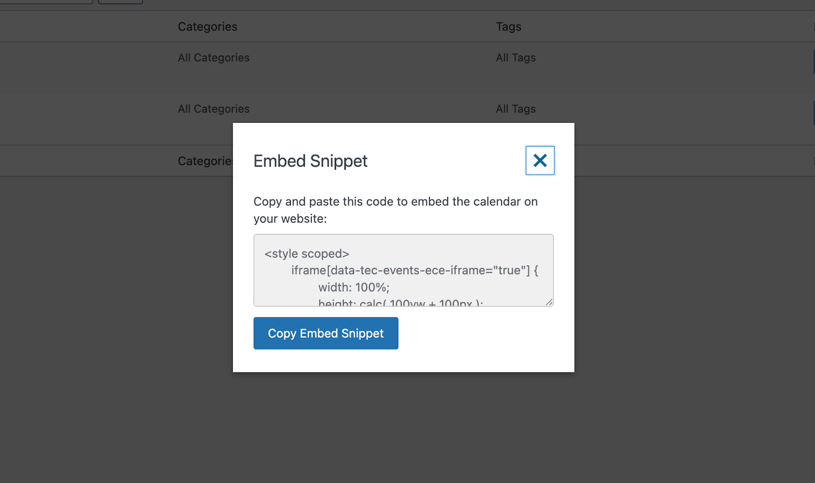 Our External Calendar Embed feature allows you to embed your events across any platform. Whether a site is built on WordPress, Wix, Squarespace, or any other platform, this embedding feature works across all of them. This feature is completely free for all users and requires no activation. It’s already available for you in your WordPress dashboard!