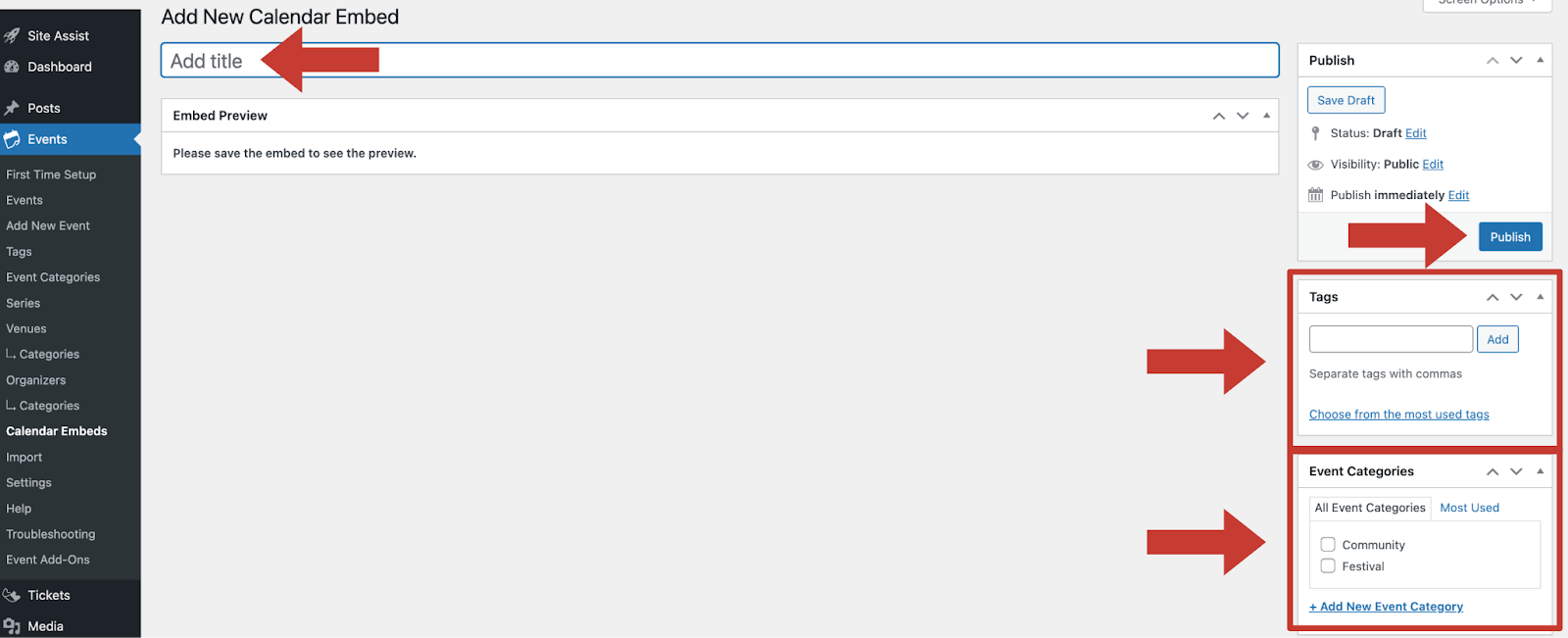 Creating an embed is easy. Add the title of the embed. Then, select the tags or event categories desired (if any). The tags and event categories you’ll see here are the same ones you’ve set up for the events on your calendars. By selecting one, you’ll filter the events shown on the embedded calendar.