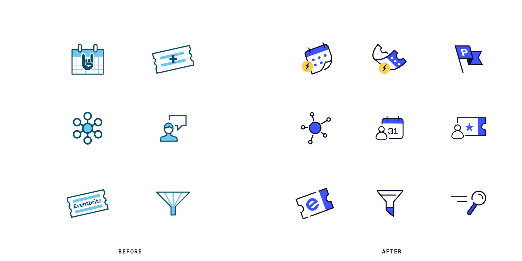 - An extended color palette. Blue and black still play a starring role in our palette, but they’re no longer the only colors we depend on. Our updated palette features a mix of colors you might call “organic”—think warm tones and neutrals, in addition to the dark, strong colors we’re known for. Tech companies can sometimes feel a little cold and distant, but we’re in the business of facilitating events that create real connections between people; the exact opposite of “cold” and “distant.” This new, warmer color palette does a better job conveying our values and our mission.
