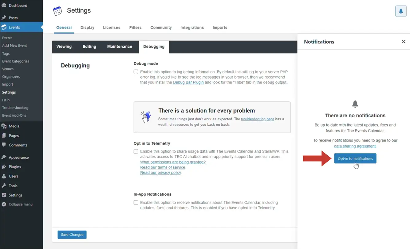 There are two ways to set up in-app notifications. The first way is to click Events → Settings → Debugging. Then, check the box to Opt-in to Telemetry and In-App Notifications. Hit the Save Changes button. Please note that you will have to opt-in to Telemetry in order to turn on in-app notifications.