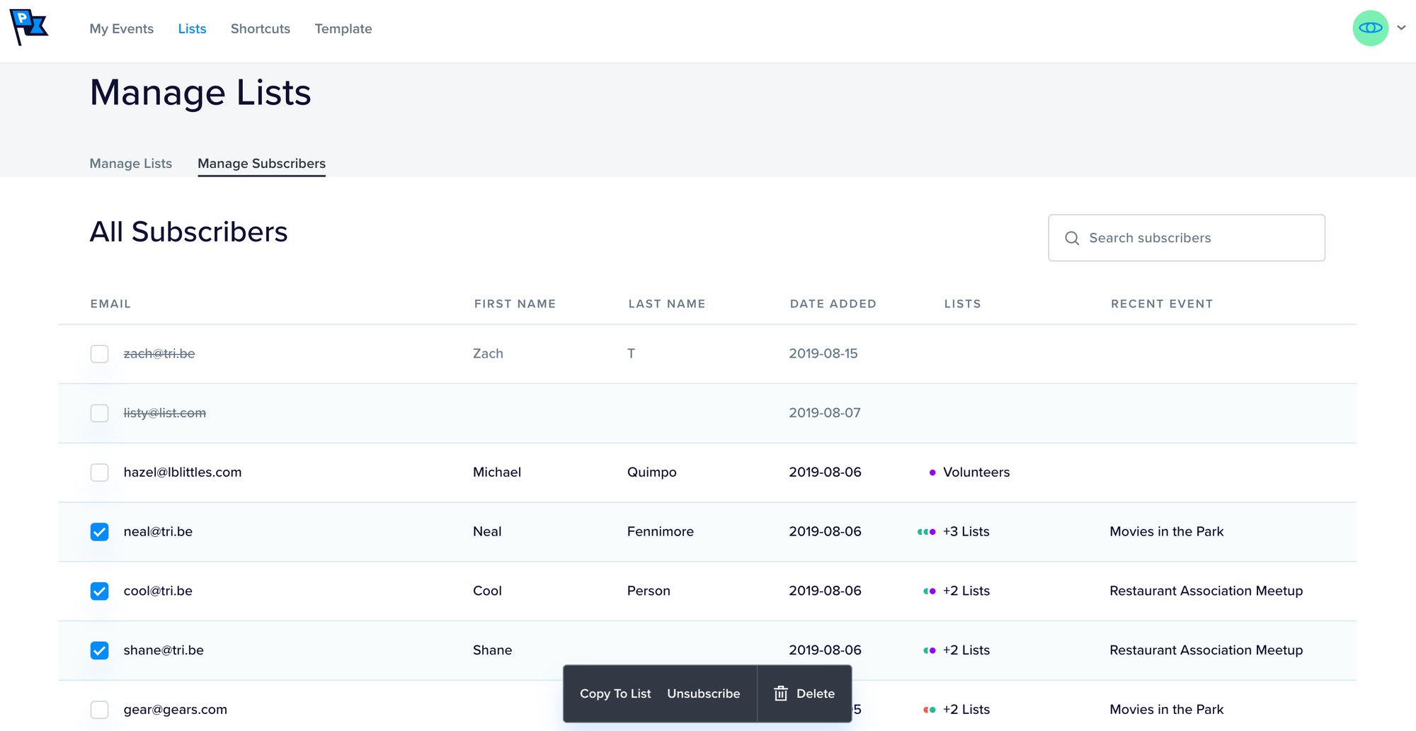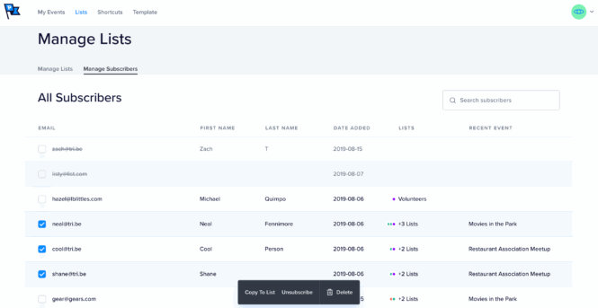 You’re also able to take a look at all of your email subscribers in this new release. This is helpful in finding a person who is a current subscriber and adding them to another list. For instance, if Raul is a subscriber because he bought tickets to your last concert, you can add him to your future concert announcements lists from this screen.