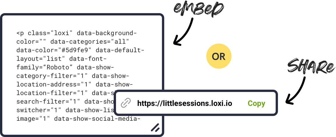 You don’t even need to have a website to use Loxi. It works as a standalone calendar, too: Use your unique Loxi link anytime you want to send people directly to your calendar. (This works great for linking to your events from Instagram, for example.)