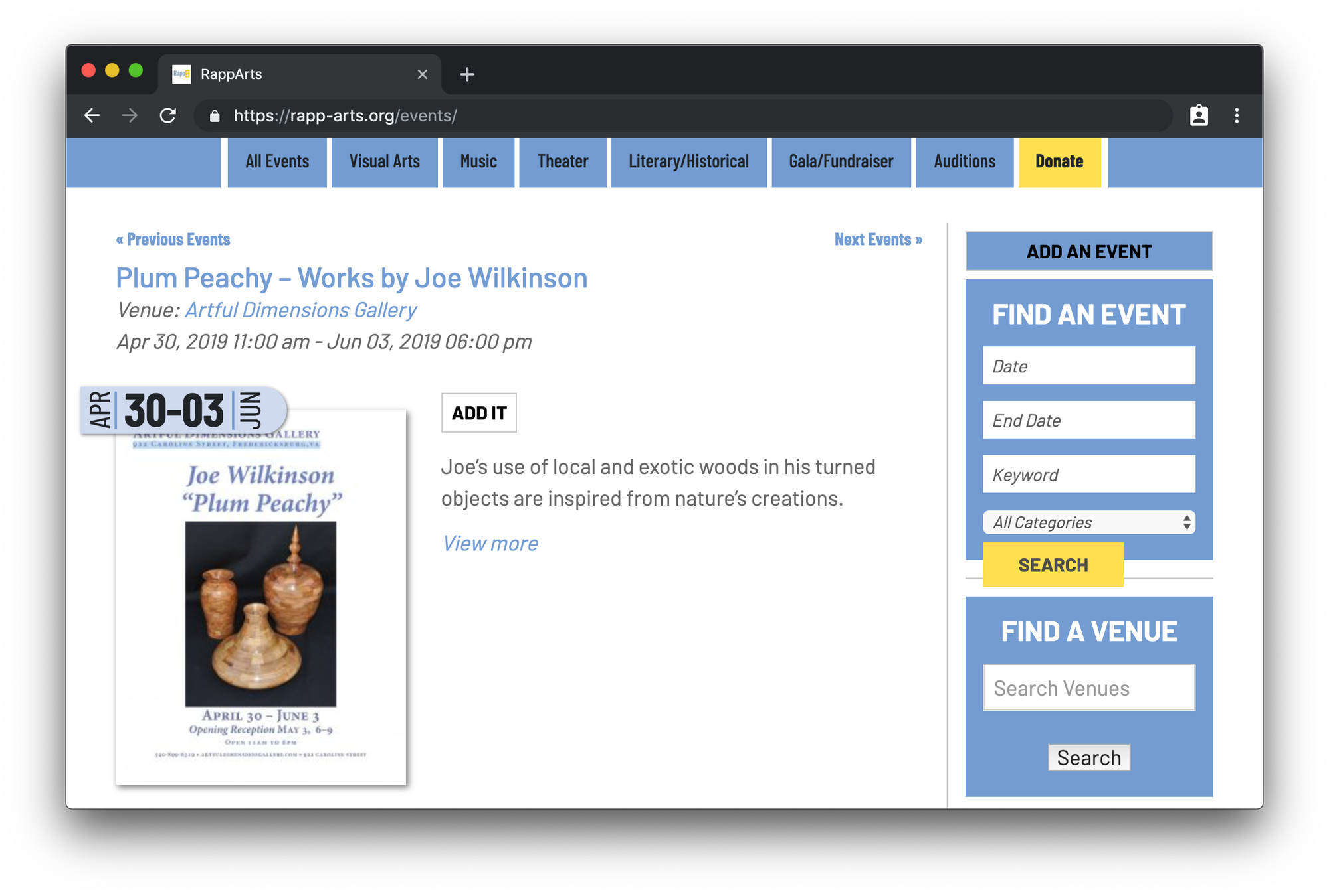 Take a cue from Rapp-Arts to make your main events page pop. They use featured images for event listings which automatically populate in their event list. As a result, they’ve added visual flair to the page. And again, the “Find an Event” and “Find a Venue” tools in the sidebar don’t look too shabby while still serving a useful purpose.