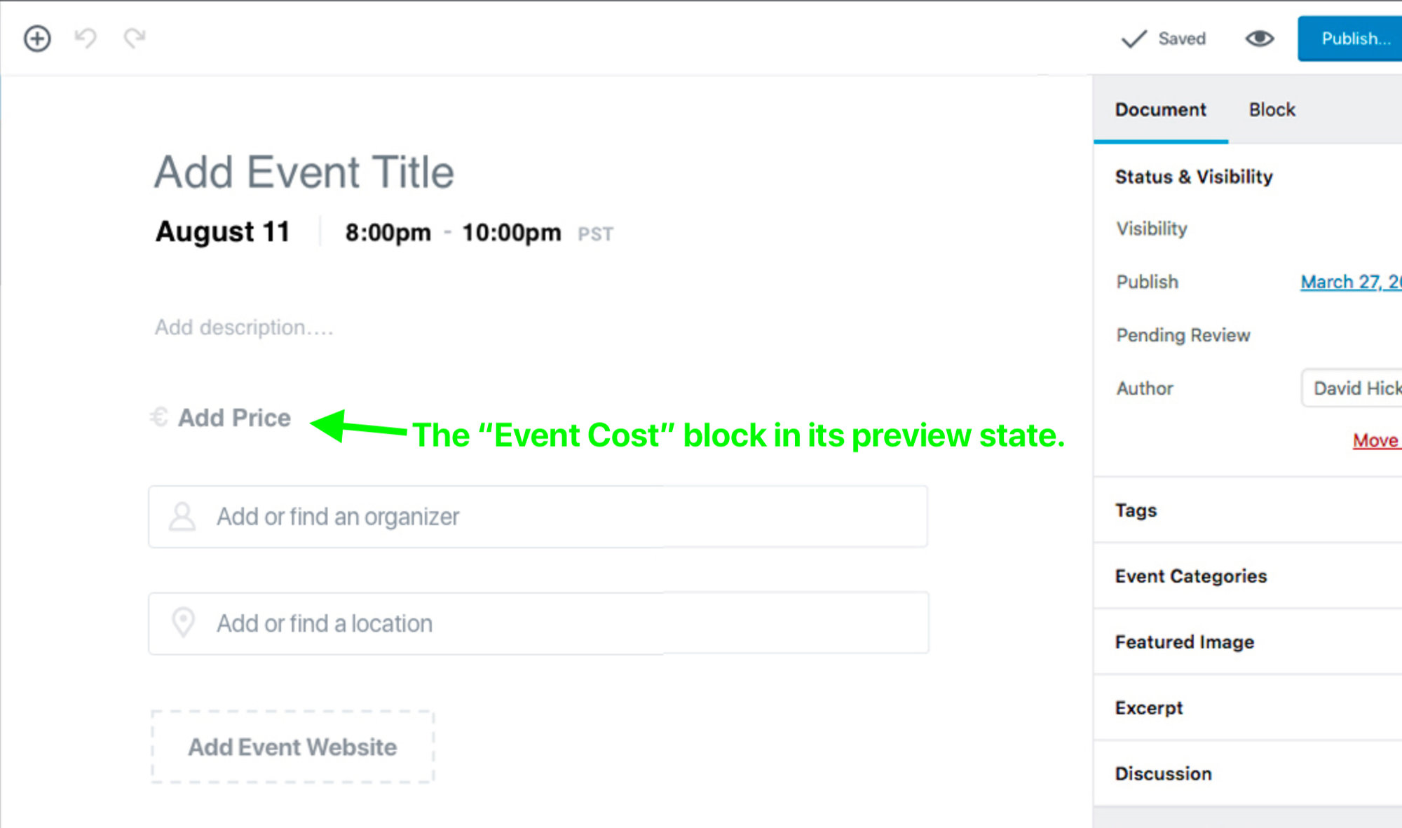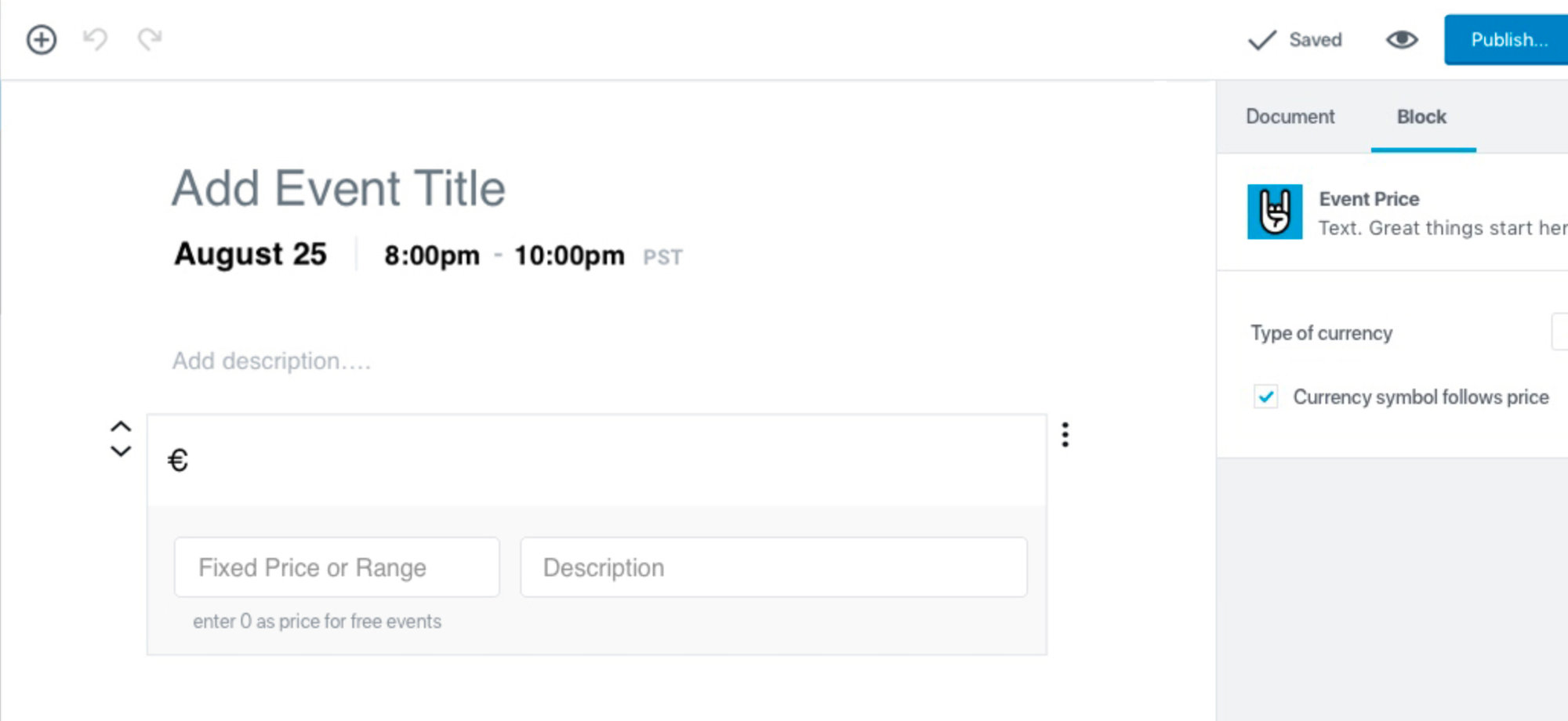 In the example of our Event Price block, however, we see the value of having distinct active and preview states. Here’s the block’s preview state, which provides a close approximation of how it will appear on the front end: