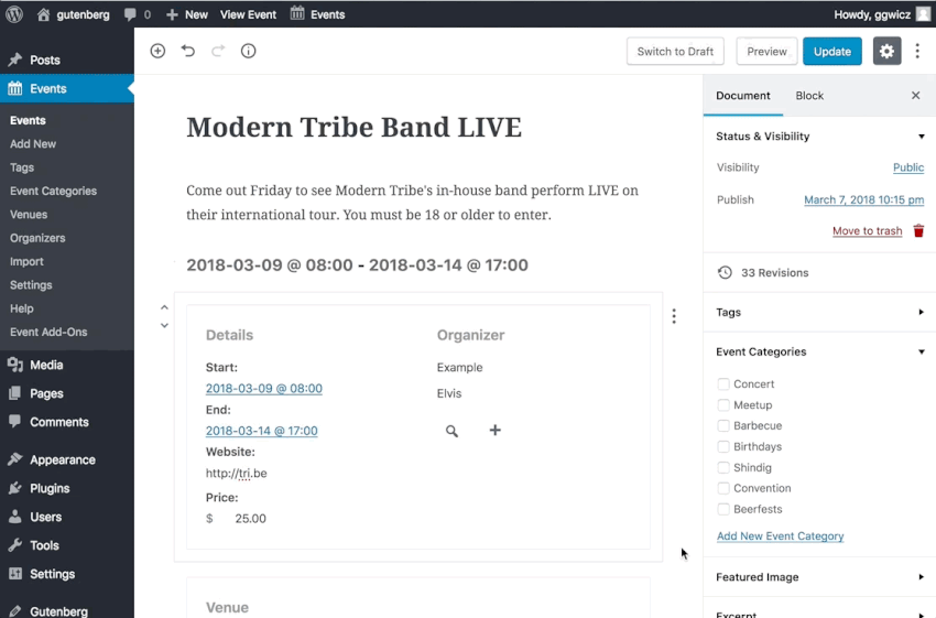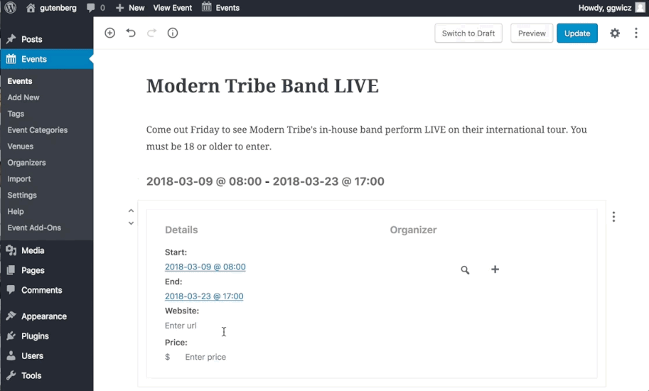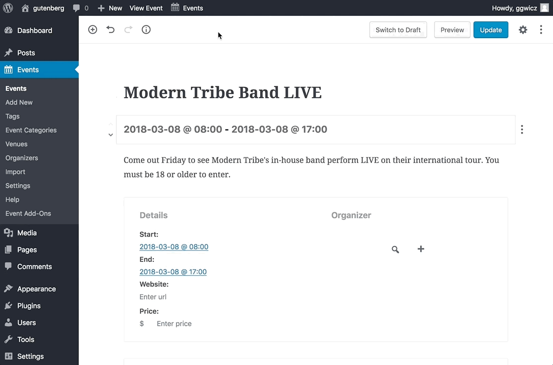 As seen in the gif above, the Event Details block is similar to the Event Details metabox—you can specify a time and date as well as add the event website, price, and organizers.