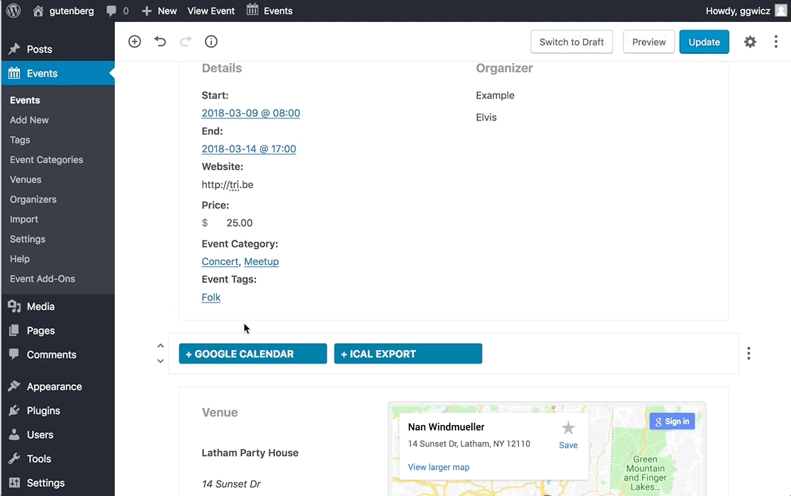 If you’ve entered your Google Maps Embed API Key in the events settings, you’ll even see a live Google Map preview will be generated right within the editor. Take a look below: