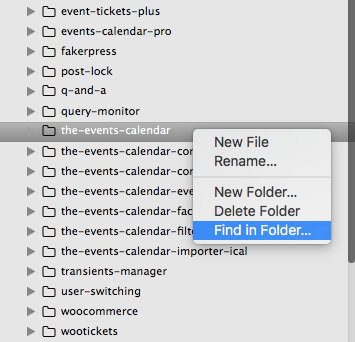 An example of the conveniently-placed “Find in Folder” feature in Sublime Text. - Next, navigate to the directory for the plugin or theme whose hooks you are trying to explore. In this example, as seen in the screenshot above, I’ll be searching for actions and filters within The Events Calendar.