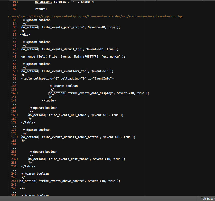 This results page is essentially the most comprehensive “hook reference” you could ever get—it will reveal each hook exactly where it is used. Here is an example results page for actions within The Events Calendar after searching in Sublime Text: