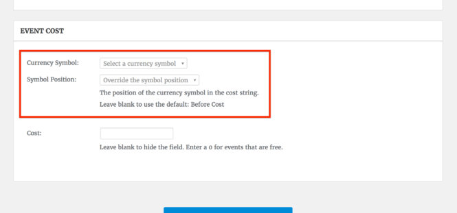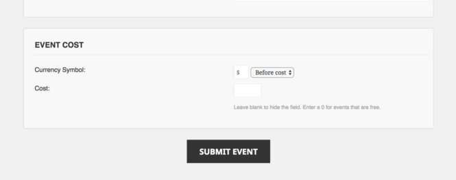 It also allows you to set a default currency symbol specific to the Community Events form that doesn’t affect the rest of the events on your site (like ones created via wp-admin).