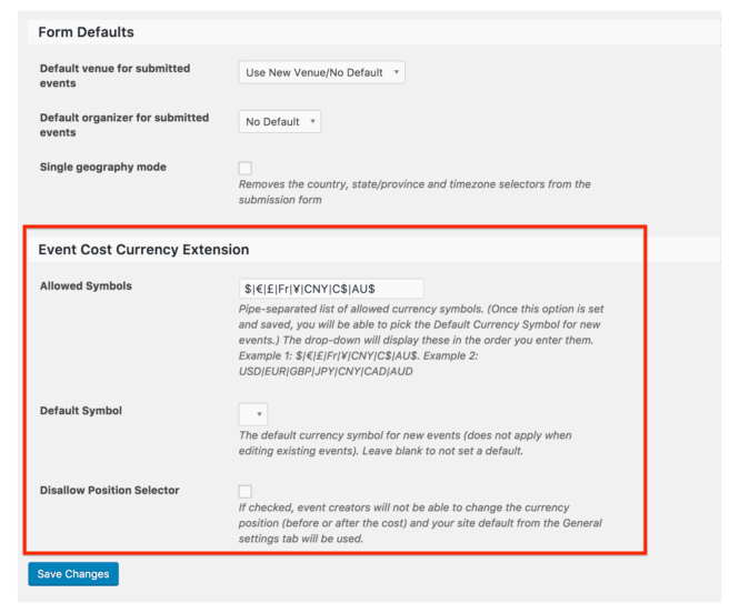 After you set the pipe-separated symbols that you’d like to enable for your event creators to choose from, refreshing the settings page will then allow you to set the Default Currency Symbol option. You have to refresh the settings screen so that the default can be picked from amongst the available options.