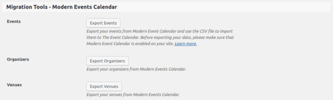This extension was created to facilitate the migration of events, venues and organizers from Modern Events Calendar to The Events Calendar. Your event data will be exported and saved in CSV files that can be used to import events, venues and organizers.