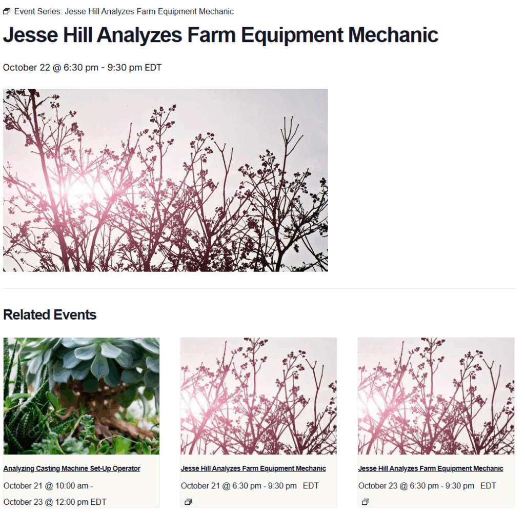 When working with recurring events, you might notice that multiple instances of the same event series appear in the Related Events section on an individual event page. At first glance, this can feel unexpected, especially if you’re aiming to use the Related Events area to showcase other upcoming events that visitors might be interested in.
