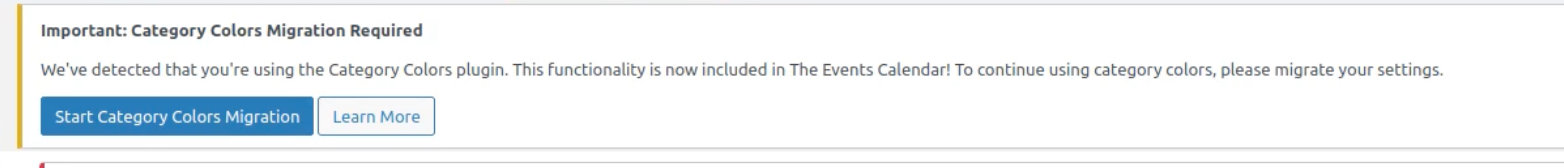 “We’ve detected you’re using the Category Colors plugin. This functionality is now included in The Events Calendar! To continue using category colors, migrate your settings.”