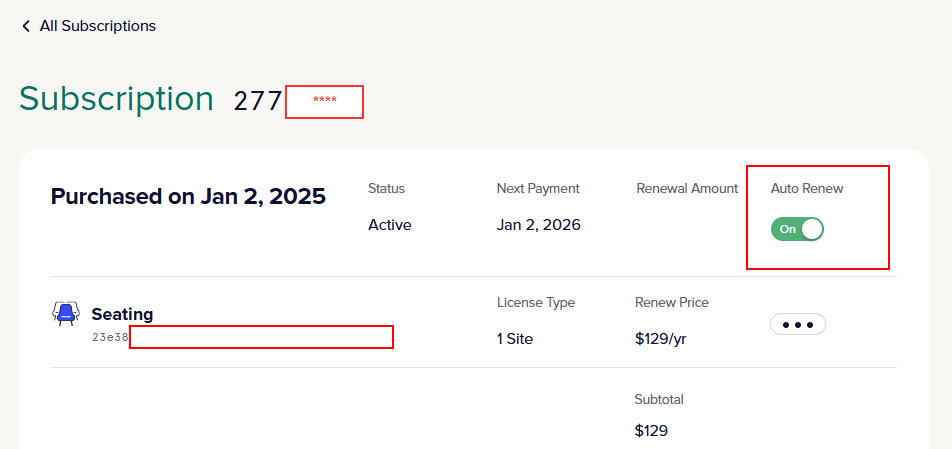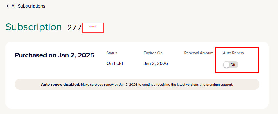 Once there, you will be able to see all the details for said subscriptions. If you would like to turn off automatic renewal, simply click the toggle button from “Auto Renew On” to “Auto Renew Off”. Note that your Renewal Date will not change but will be renamed to your Expiration Date.