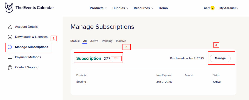 Log in to your The Events Calendar account to turn off automatic renewals for one of your existing subscriptions, cancel future payments, and leave your license active until the end of its current term.