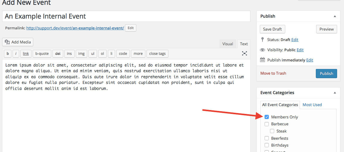 This method is fairly simple to implement. First, create an event category that all members-only events will belong to. In the following screenshot, this is exemplified with an event category called “Members Only”: