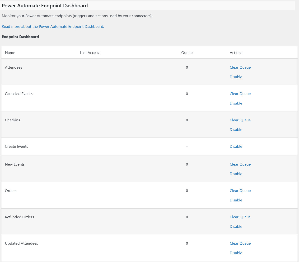 As you can see from the screenshot above, the Dashboard lists all endpoints available for The Events Calendar and Event Tickets Power Automate connectors.