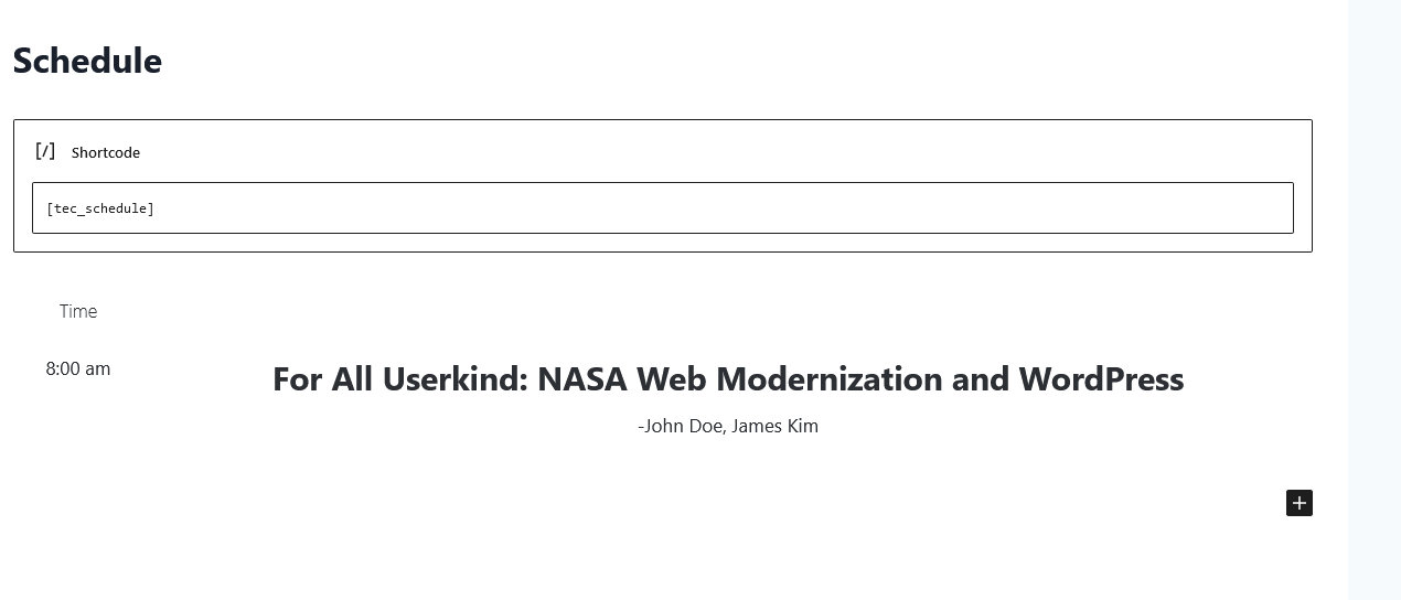 Once you created all of the sessions you need for your schedule, it’s time to display them on a page or post. This can be done in one of two ways: