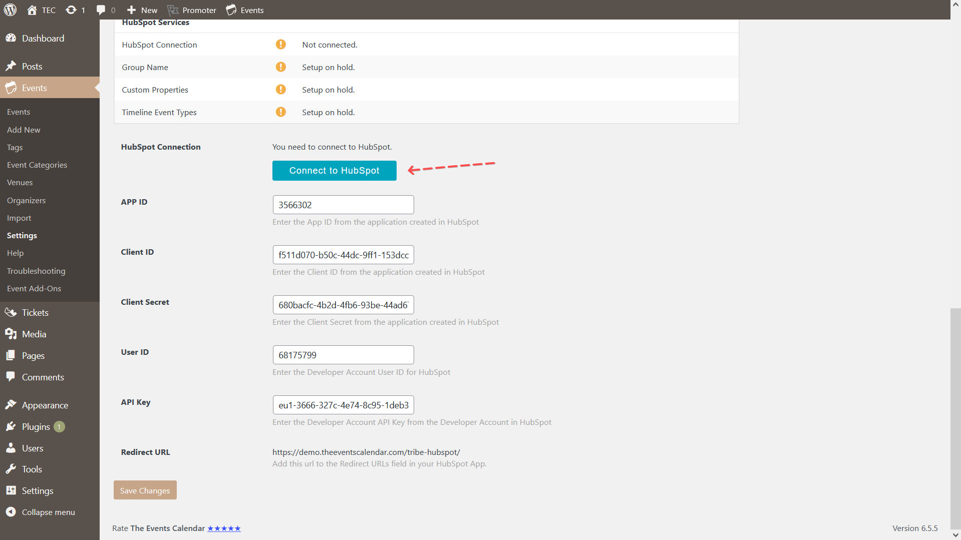 Once you’ve installed and activated the plugin, head over to Events → Settings → Integrations. This is where the API information from HubSpot will be entered.