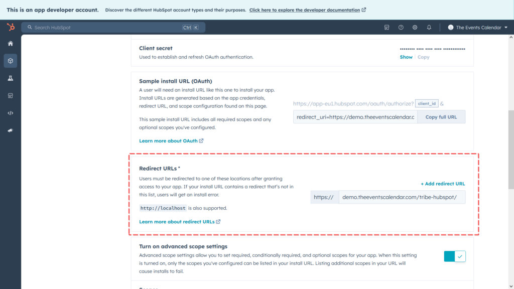 - Redirect URL: This is the URL you will need to copy to the HubSpot app. See below.