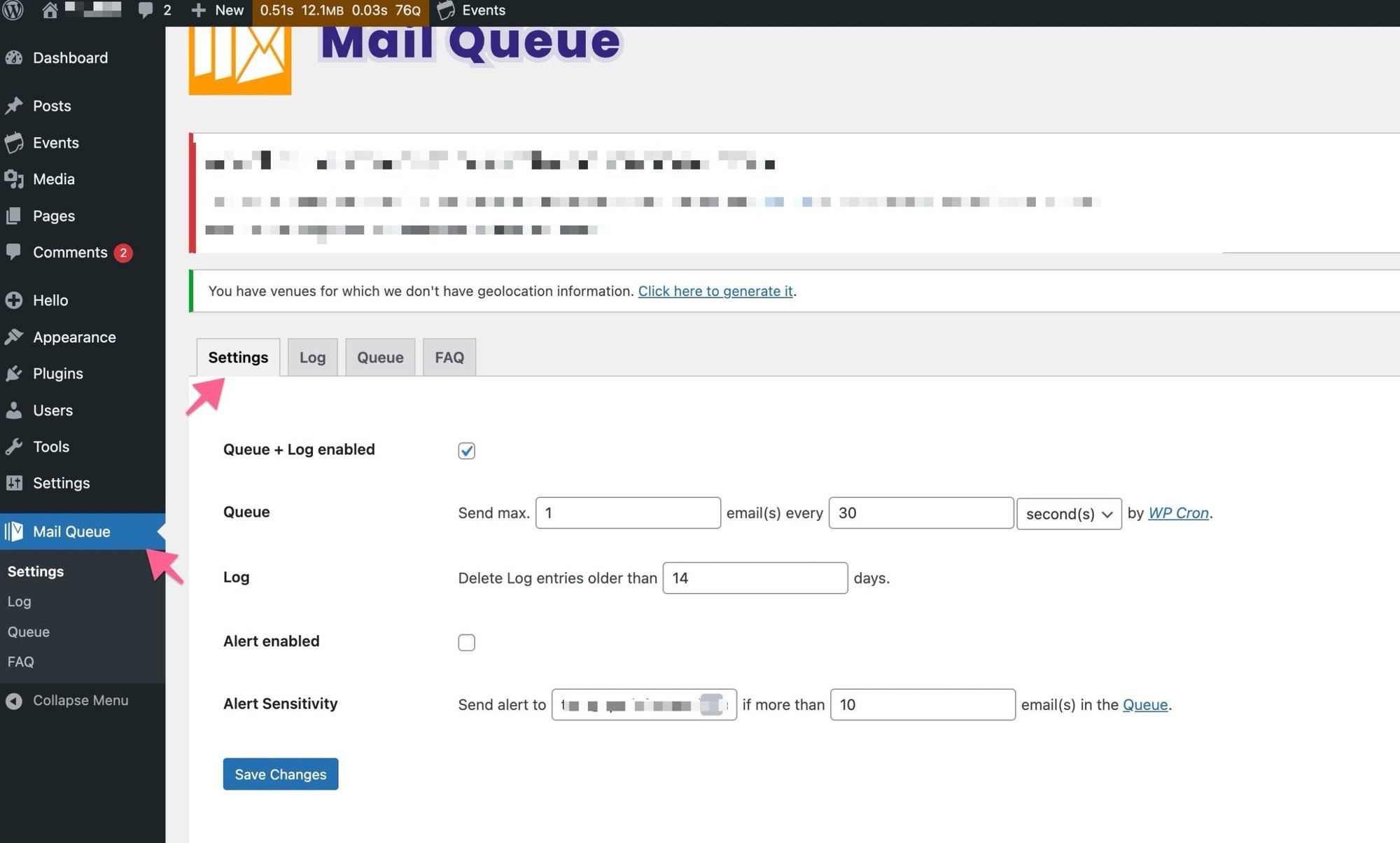 A few users reported that when they have the setting “Send an email alert when a new email is submitted” enabled under Events > Settings > Community > Alerts the community form submission takes 8-10 or seconds to get submitted. If you are experiencing the same, you can fix it by installing the Mail Queue Plugin and setting it something like this: