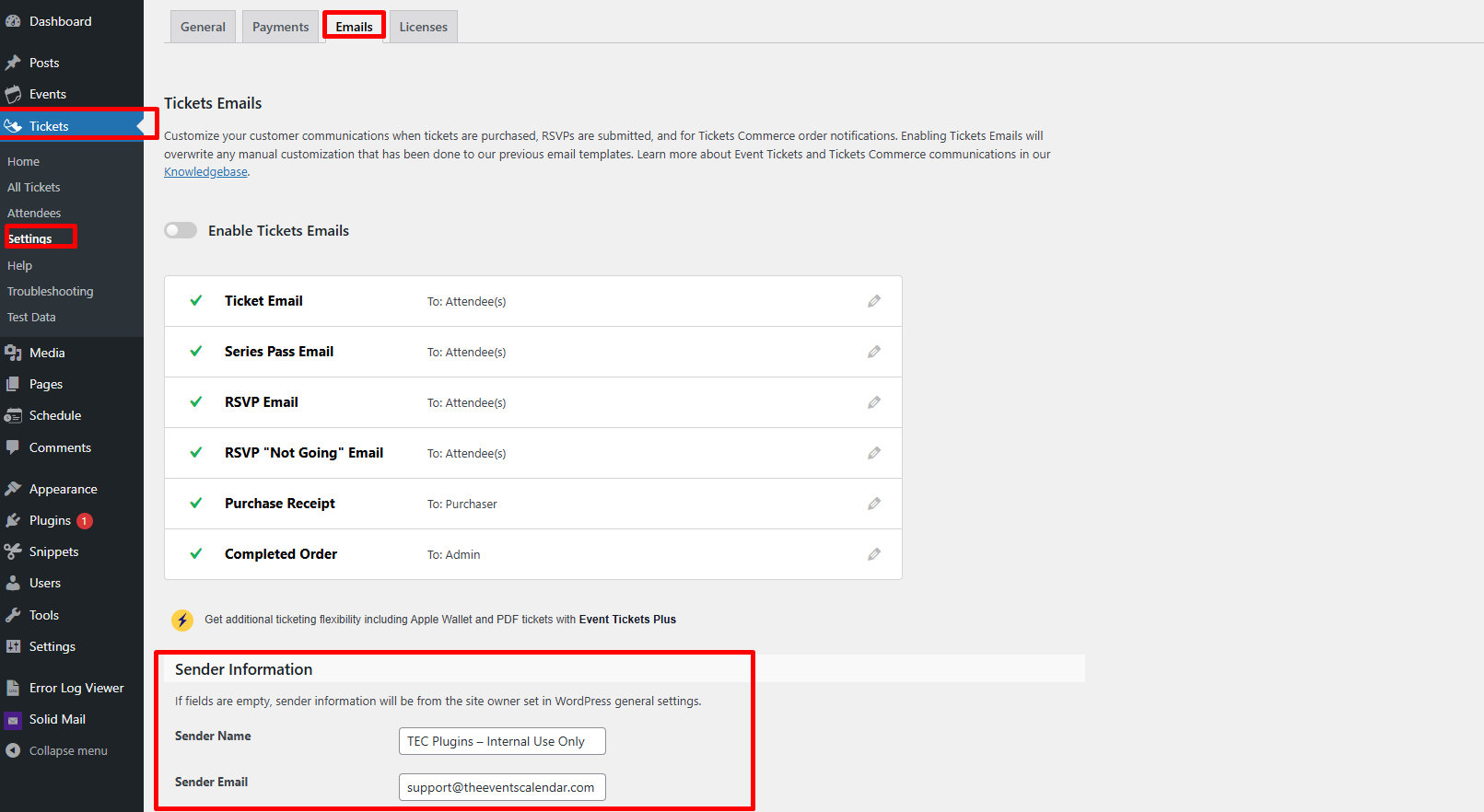 - Go to Tickets > Settings > Emails in your WordPress dashboard.