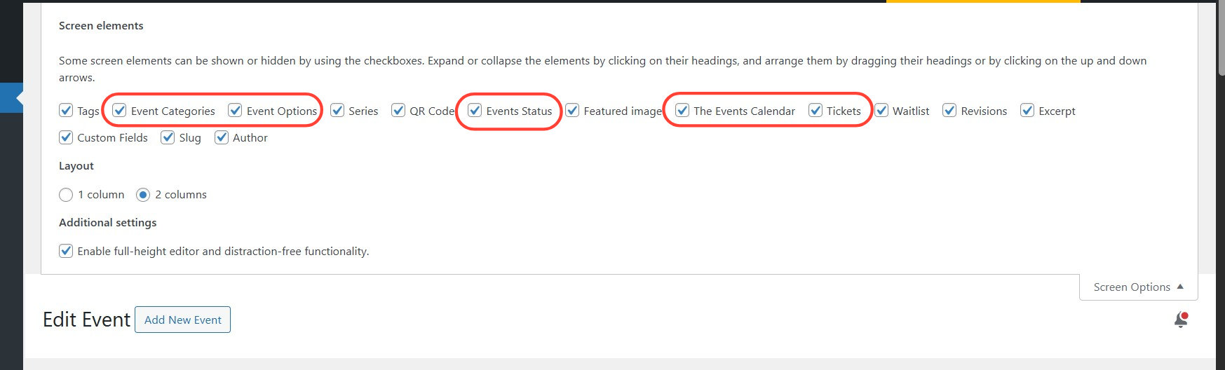 - Some themes override admin CSS or JavaScript, which can hide or break the layout of the event editor.
