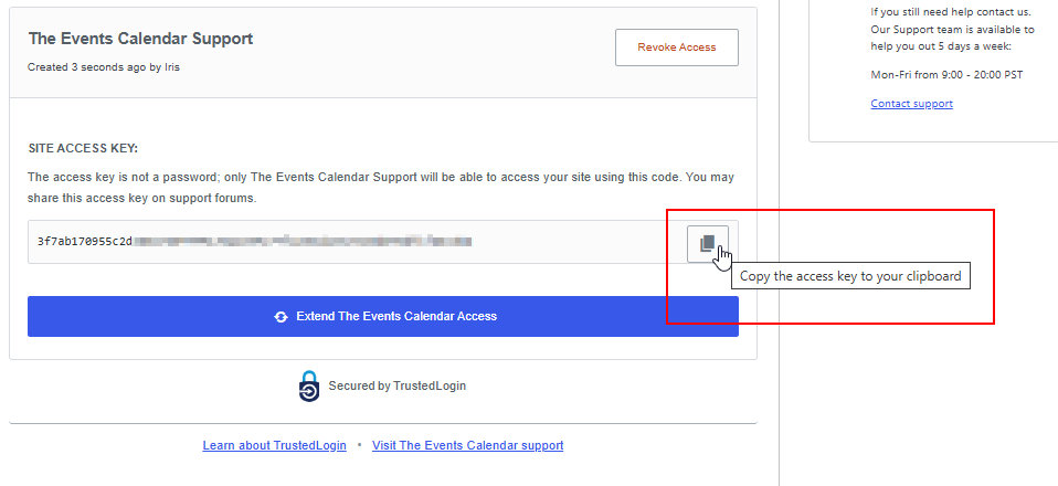 In your support ticket, copy and paste the generated Site Access Key. Let the support team know that TrustedLogin has been set up. That’s it! |