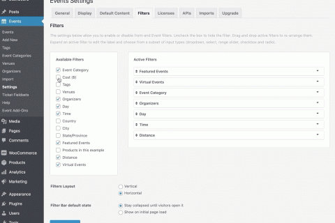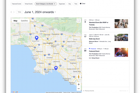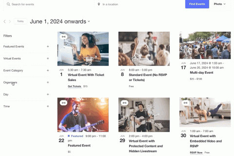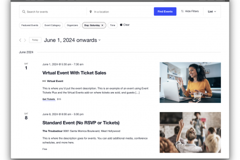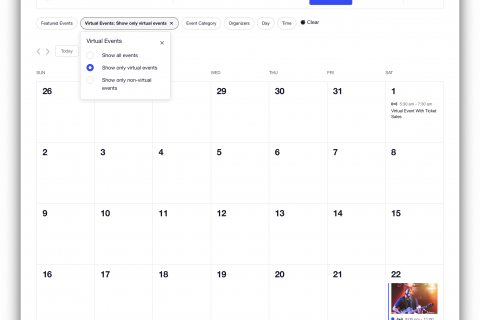 Help visitors to your WordPress site find the events they’re looking for on a busy calendar with filters for virtual events, venue, date, category. and more.