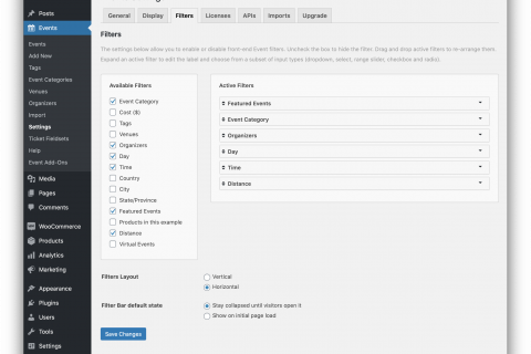 The custom filters feature takes the additional fields you create in Events Calendar Pro and allows you to add those fields as filters. For example, let’s say you create an additional event field called “Dress Attire” and use it to specify how formal the event is with options including: