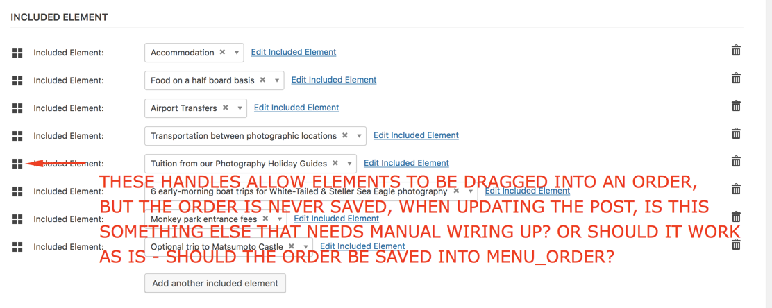 I fully understand that the function outputs the linked post types – below is the code – bastardised from your functions that outputs them – please answer the basic question first – do the drag handles support reordering of the linked post types?