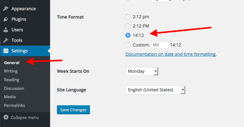 After each step in that process, go back to Settings > General in your wp-admin. Ensure your “time format” setting is still 24-hour time mode, and click “Save Changes”, even if you do not change anything.