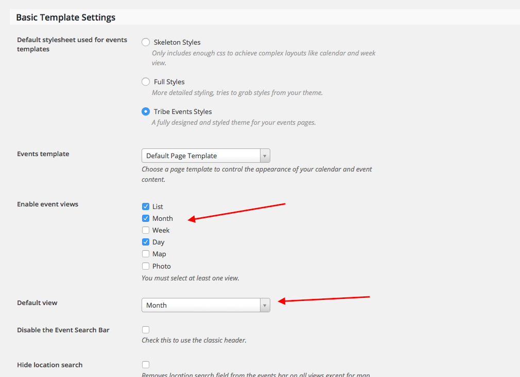 3. In regards to the issue of things being stuck on “Photo View”, can you head to Events > Settings > Display in your wp-admin, and tell us what you have configured for the “Enable Event Views” option and the “Default View” option? Here’s a screenshot of these options for reference: