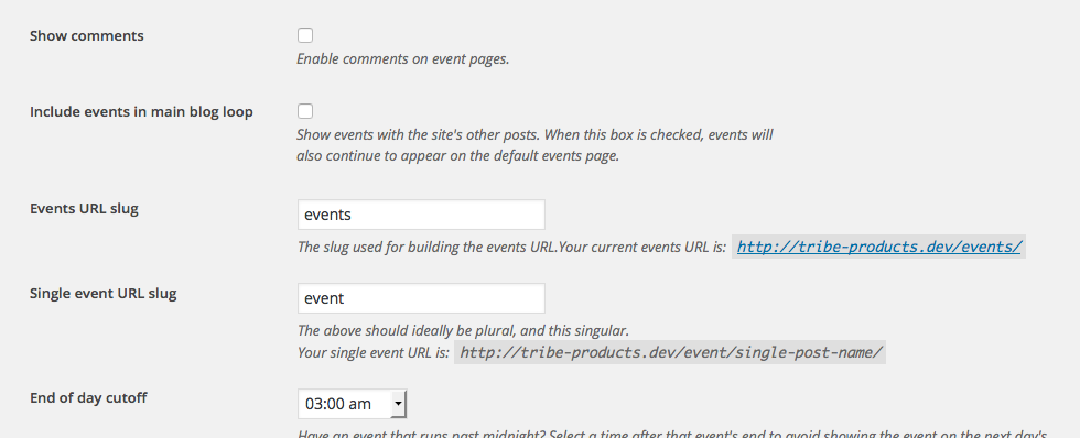 Once that “Page” is deleted, go to Events > Settings. Right there on the “General” tab, set the “Event slug” option to calendar. Here’s a screenshot of this option:
