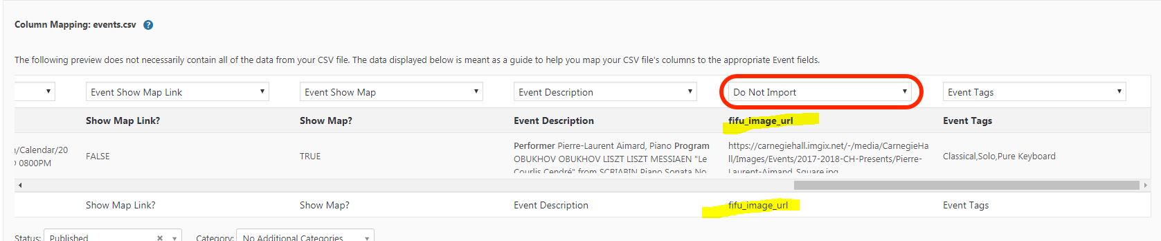 ParticipantHi Victor, Thanks for looking carefully at the screen shots. You are right that on that one I did not import the field, although I did previously before collecting my screen shots. When I do it once more, I see that the fifu_image_url has been imported as an “Additional event field” but not as a “Custom field.” (Please see the new image.) What I need for the “Featured Image From URL” plugin is a custom field. If use the custom field drop-down to add the fifu_image_url field, it is accepted and I see my image. Is that possible to do using the importer?