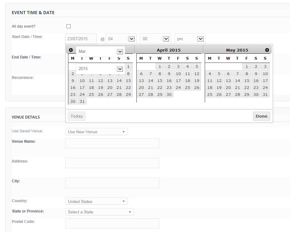 ALL the form fields stretch across the full width of the screen. So Start Date is full width and even the time Hour and Time Minutes and even the AM / PM etc. It doesn’t really look good and not sure why it is not like the Administrator version.I will try add a screenshot here so you can see. Can you help with this at the same time?