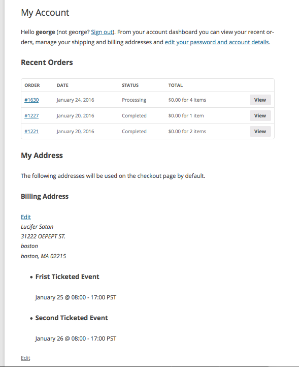 My goal would be to add another section to the My Account page (the page that is shown in the first screenshot) with a heading “My Events” and list the events they have purchased tickets to with a link to the event page.