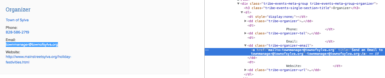 ParticipantHere’s an example link with email echoing only the value and not an anchor: https://www.discoverjacksonnc.com/event/sylva-christmas-parade/