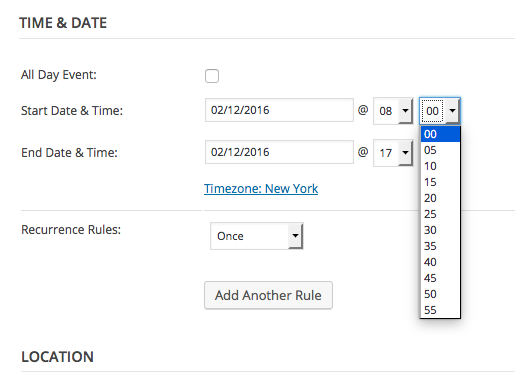 The Events Calendar itself does default to five-minute increments, as shown in this screenshot: