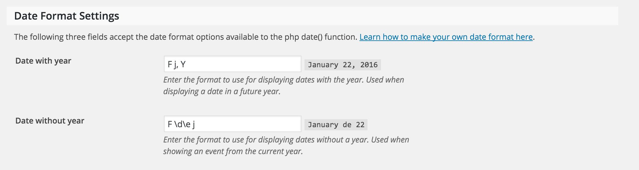 For the date format escaping literal characters, when I’m using English language for WordPress settings, changing “Date without year” format from the default “F j” to “F \d\e j” causes both the instant preview date and the wp-admin list of Events posts to display the same: