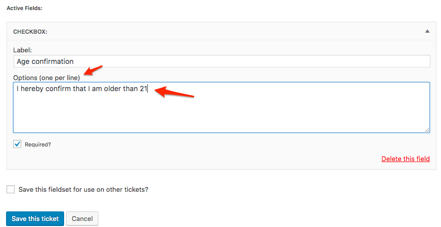 ParticipantTrying to sell tickets to an event and since we’re serving alcohol, we want to have a checkbox to validate attendees are 21+. Created a fieldset with a checkbox for just that, but it’s not appearing in the order or in checkout. Already did the various tests, and no change. Just not seeing the order.