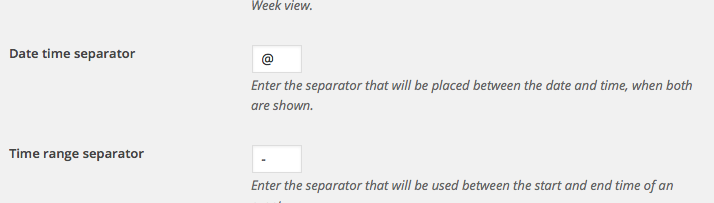 Next, in regards to the @ time separator, head to Events → Settings → Display in your site’s wp-admin and look for this option: