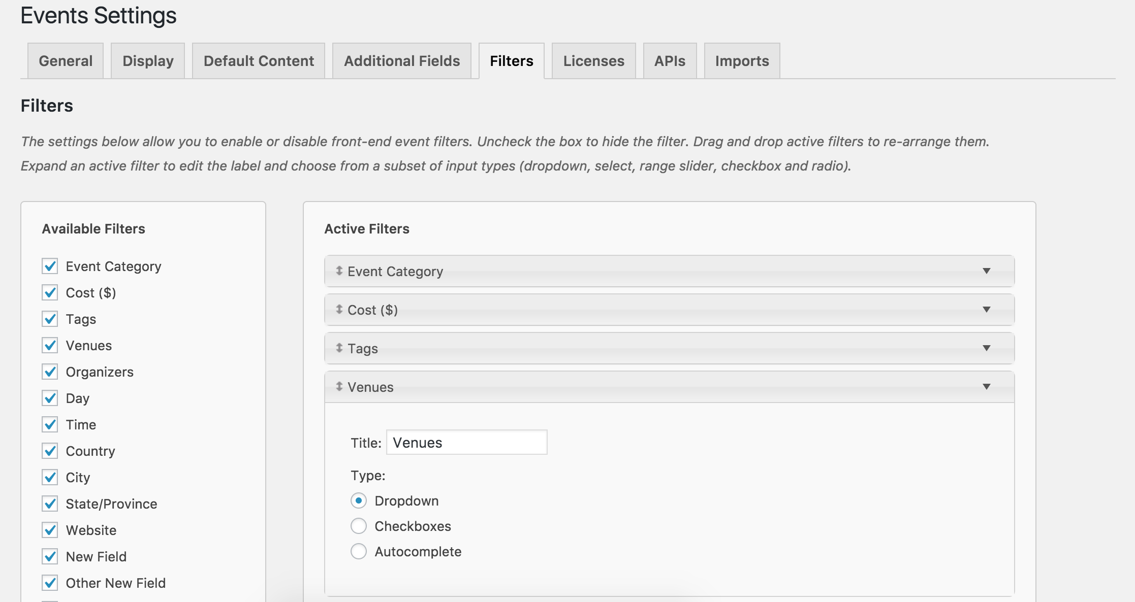 Welcome back and thank you for reaching out. To add venues to the Filter Bar, visit Events > Settings > Filters and make sure the ‘Venue‘ checkbox is checked under the ‘Available Filters‘ column. (see screenshot below)