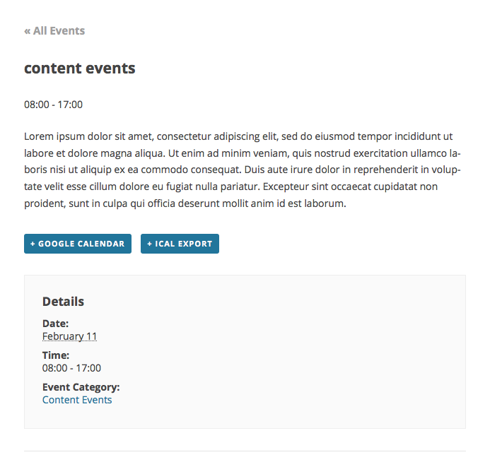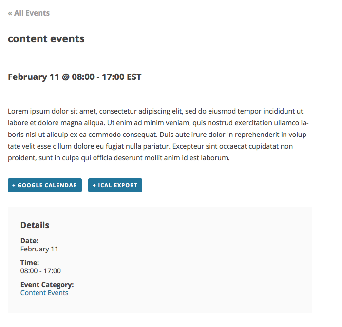 To demonstrate the approach I am recommending here, let’s start with a screenshot of a “normal” event that is in a category called “Content Events”: