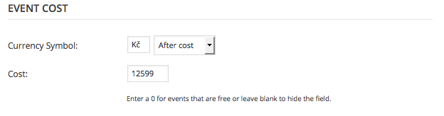 In the admin-facing cost field for events, just leave your prices without spaces in them. So, to use your example of 12 599 Kč, you would enter this in your edit-event screen as 12599. Here’s a screenshot of this: