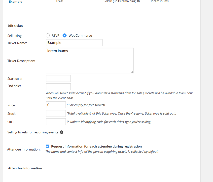 • For the tickets you have, click the “edit” link that pops up upon hovering over the ticket. Here is a screenshot of what I mean for reference:• Clicking that link will expand the ticket settings for the ticket. Here is a screenshot of that, for example:
