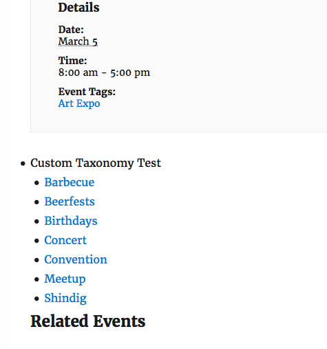 With the option you provided, would that show the selected taxonomy in a post and have each be a clickable link to go to all events they’re featured in? It’s difficult to explain, so hopefully I’m doing a decent job.