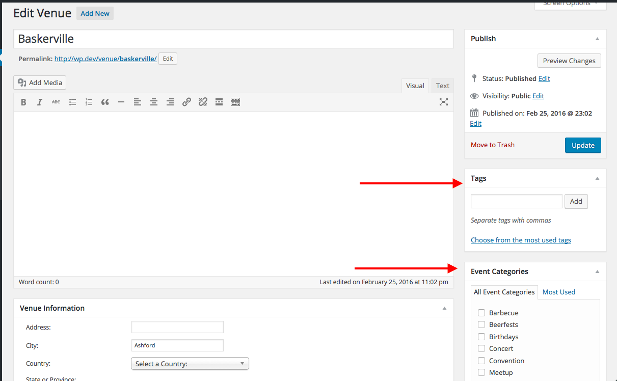 register_taxonomy_for_object_type( 'post_tag', 'tribe_venue' );