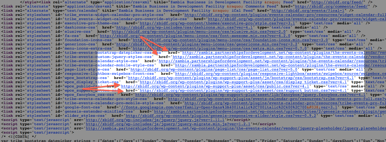 Check out this screenshot, for example, of your page’s source code – note how some scripts are loaded from zbidf.org, while others (especially ones from The Events Calendar) are being loaded from zambia.partnershipsfordevelopment.net: https://cloudup.com/cWigPRVJJQy